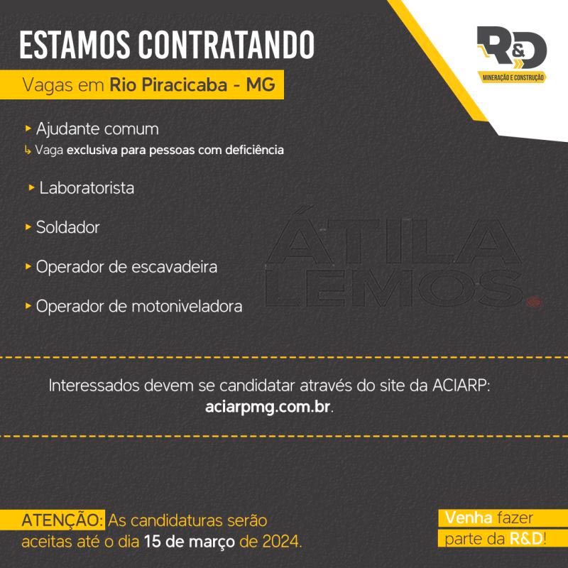 VAGAS na R&D Mineração e Construção em Rio Piracicaba