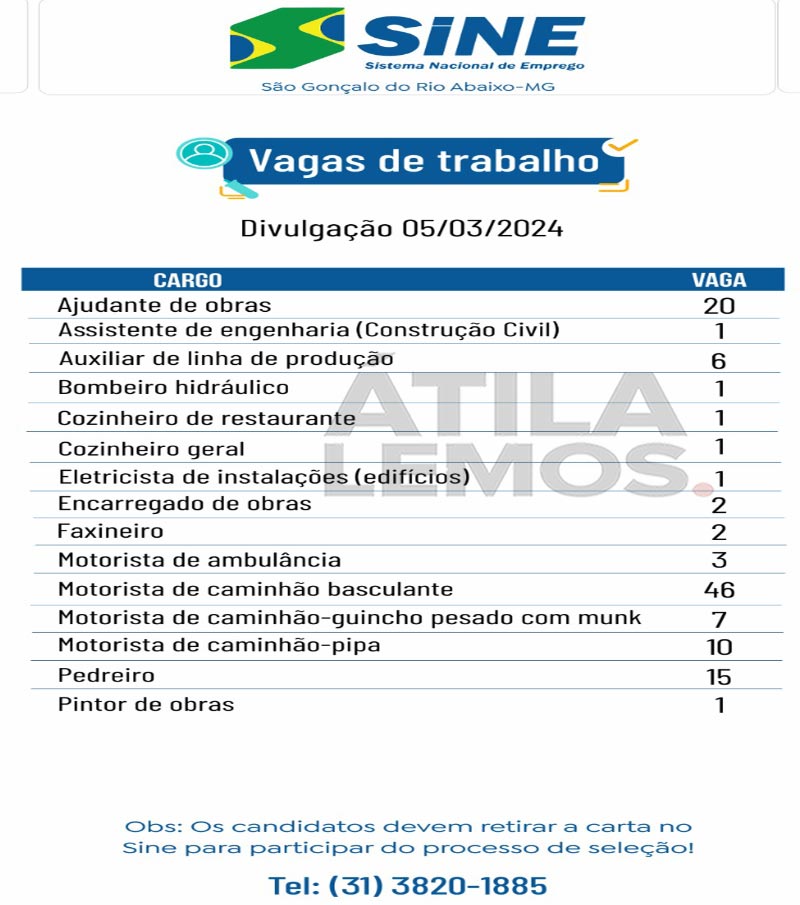 O SINE de São Gonçalo do Rio Abaixo está ofertando um total de 117 VAGAS de emprego.