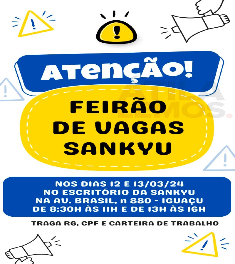Na próxima semana nos dias 12 e 13 de março, a Filial de Ipatinga, estará realizando um “Feirão de Vagas” no seu escritório, localizado na avenida Brasil, nº880 – Iguaçu.