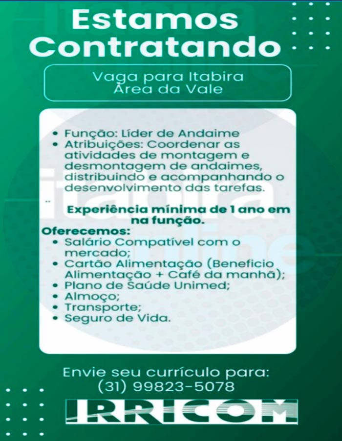 As pessoas interessadas na divulgação, deverão encaminhar o currículo para o whatsapp descrito na vaga. Lembre-se os interessados no emprego, devem sempre entrar em contato direto com a empresa. Interessados enviar currículo para: 31 99823-5078