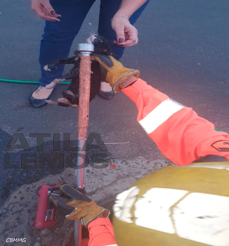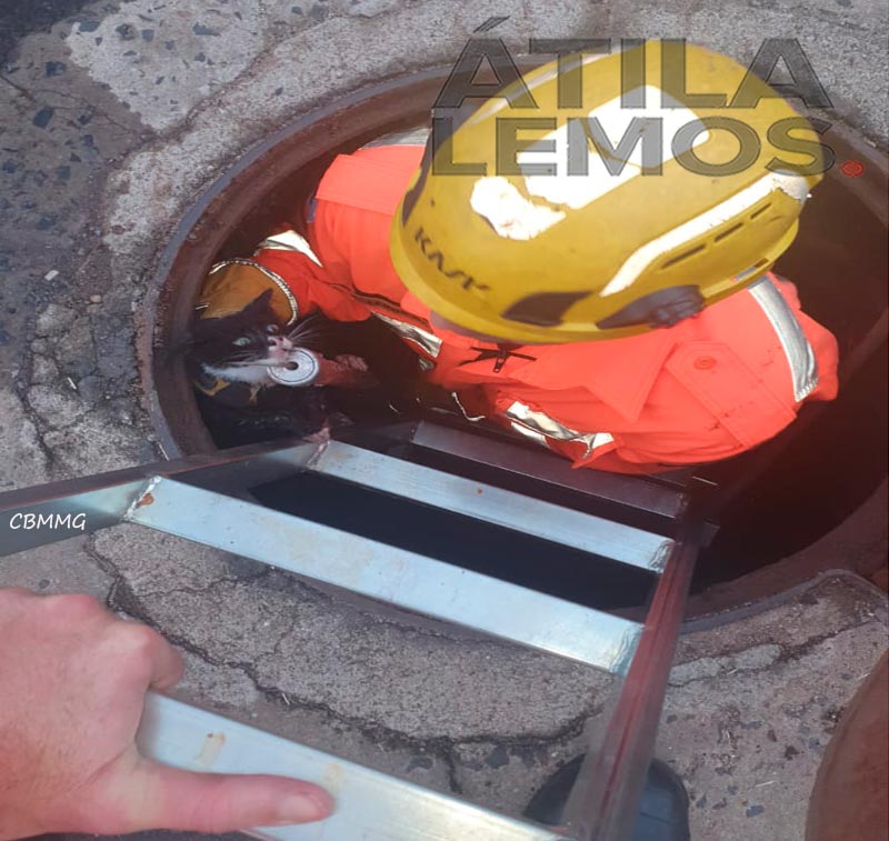 Os Bombeiros foram chamados para verificar uma situação onde um filhote de gato que foi atacado por grupo de cães em via pública, o felino até conseguiu fugir, mas acabou caindo em um bueiro no Bairro Residencial Paulo Cury, fato ocorrido em Uberaba/MG.