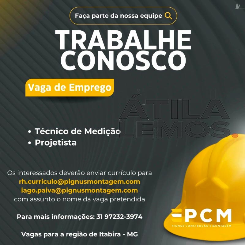 Pignus Construção e Montagem está contratando para trabalho, maiores informações e envio de currículo pelo no e-mail descrito na imagem.