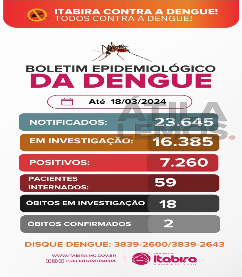 A Secretaria Municipal de Saúde, por meio do Controle de Endemias, divulgou neste (19/03), um novo Boletim Epidemiológico referente à Dengue, até o dia 18/03. Segundo as informações, a cidade registra 23.645notificações, 16.385 casos em investigação, casos positivos 7.260 e 59 pacientes estão internados. Óbitos em investigação somam 18 e 2 casos confirmados.