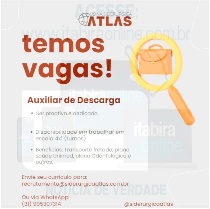 Trabalhador que estiver interessado em se candidatar precisa enviar seu currículo para recrutamento@siderurgicaatlas.com.br