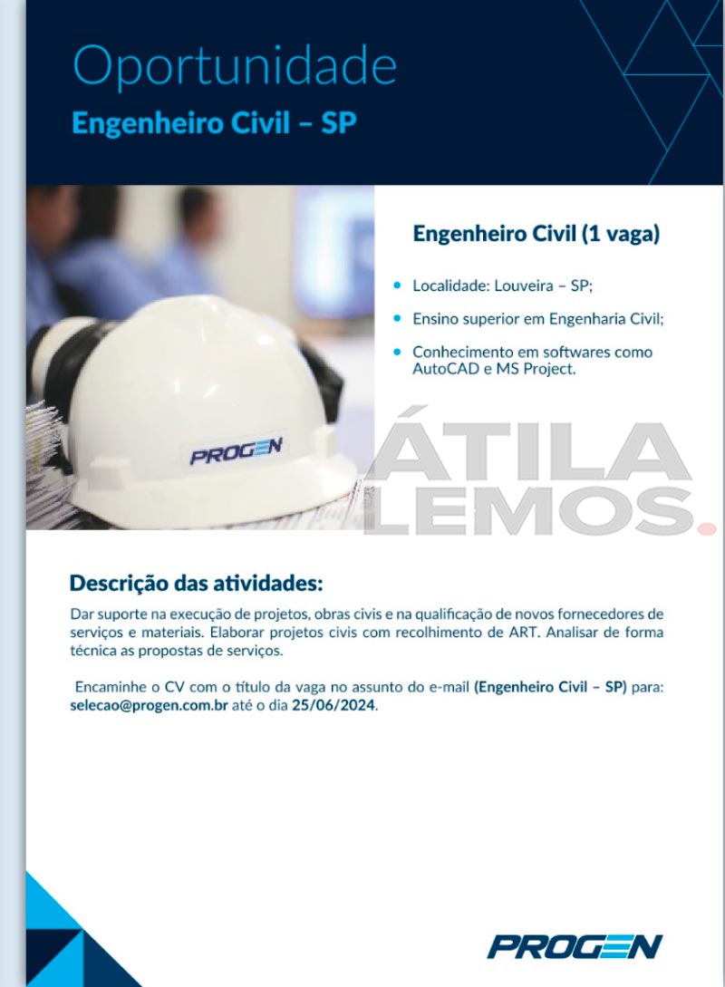 – Engenheiro Civil (1 vaga), em Louveira – SP.