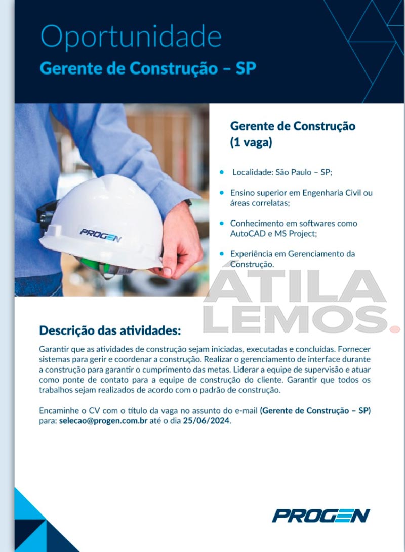 – Gerente de Construção (1 vaga), em São Paulo – SP;