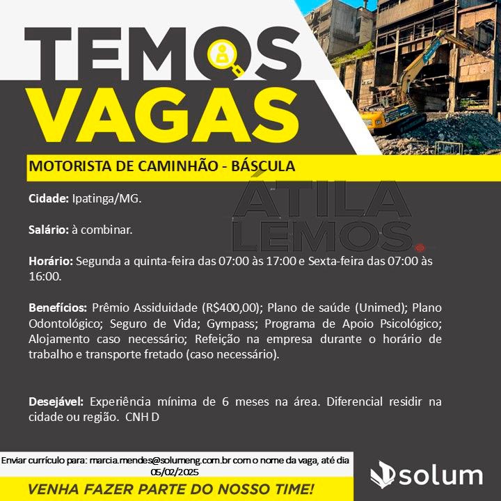 Enviar currículo para: marcia.mendes@solumeng.com.br com o nome da vaga, até dia 05/02/2025. Se você é uma pessoa com deficiência (PCD) e está incerto sobre a adequação de nossas oportunidades, não se preocupe. Sinta-se à vontade para se candidatar a qualquer uma delas!