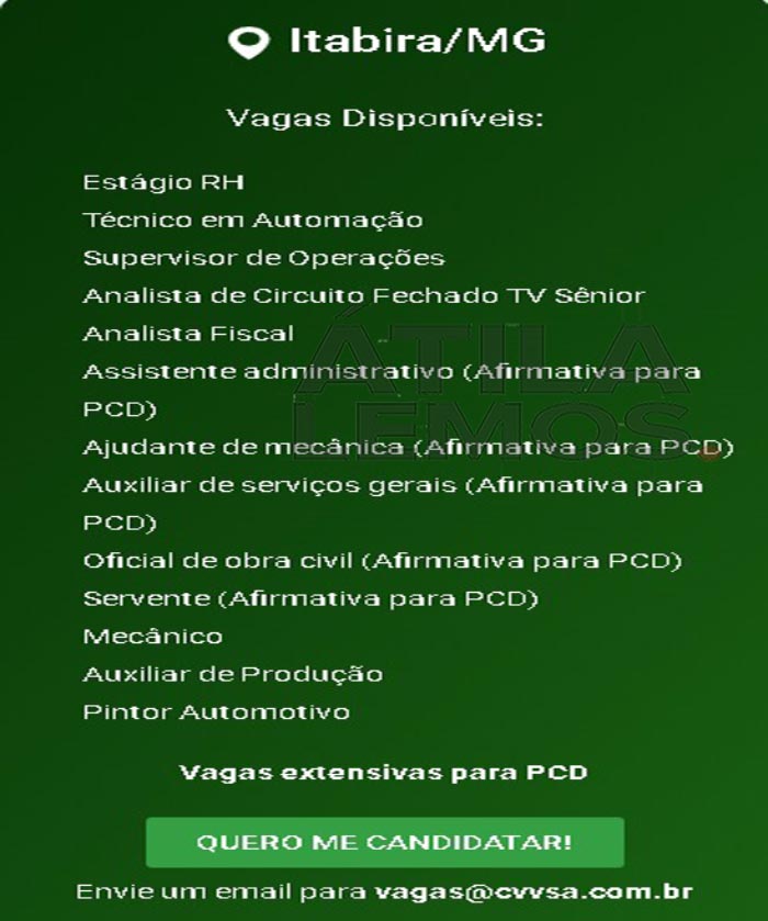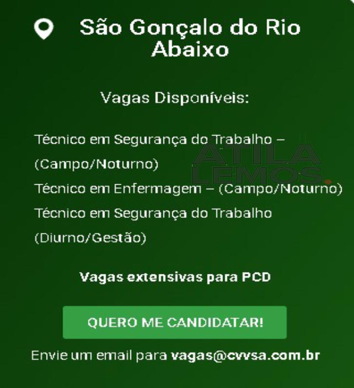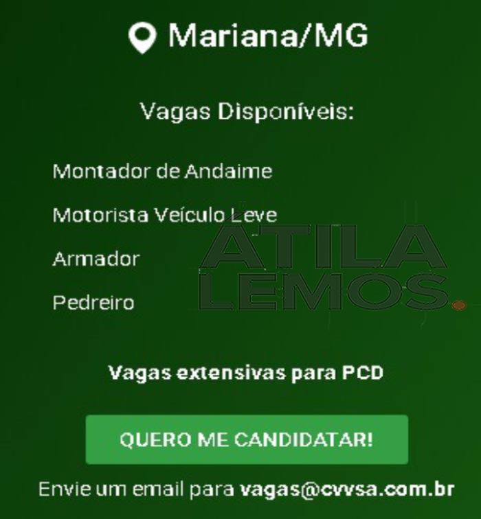 VAGAS para Itabira, São Gonçalo e Mariana na Vale Verde