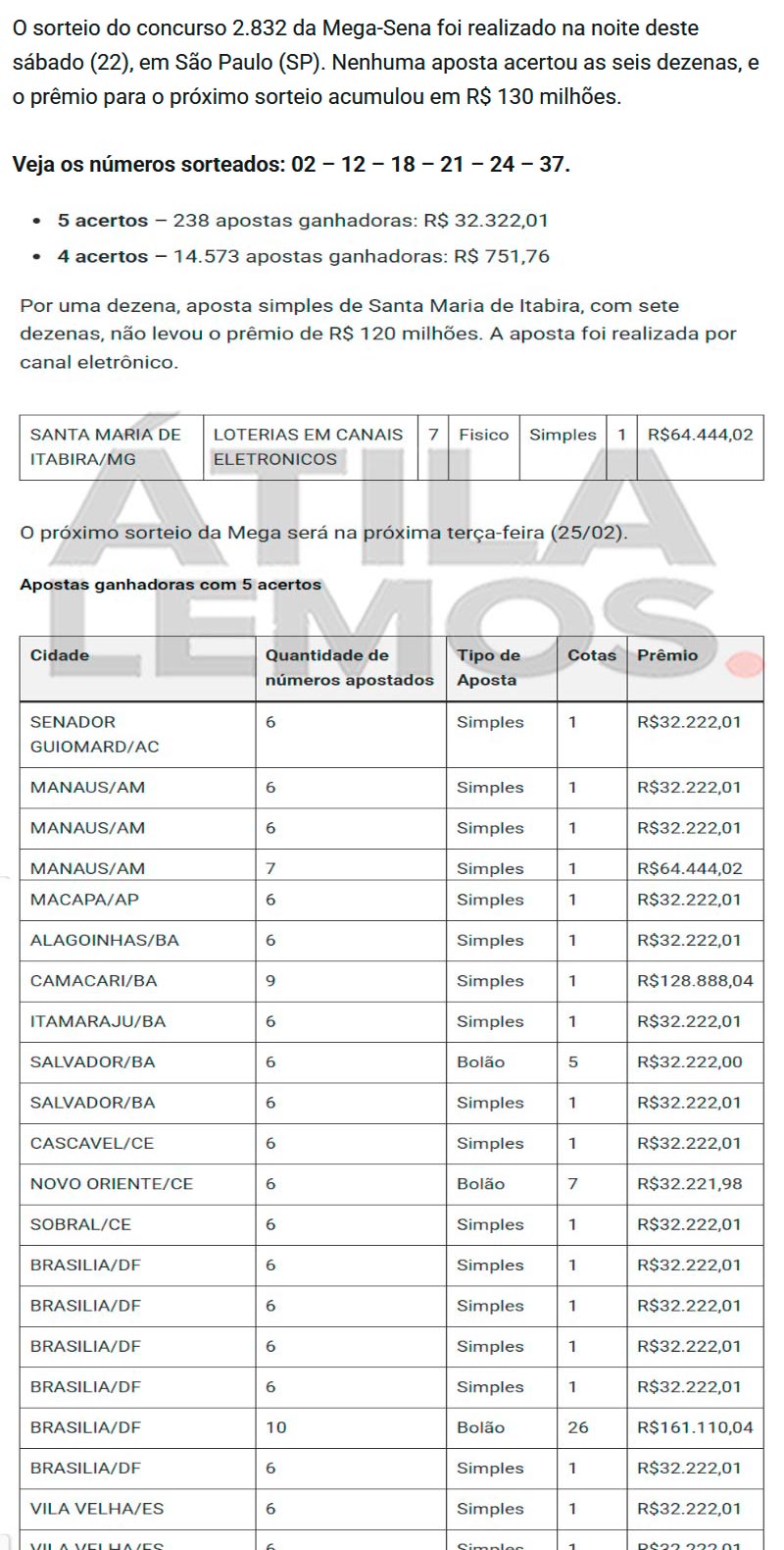 Aposta da cidade de Santa Maria de Itabira “bateu na trave” e quase levou o prêmio de R$ 120 milhões na Mega Sena.