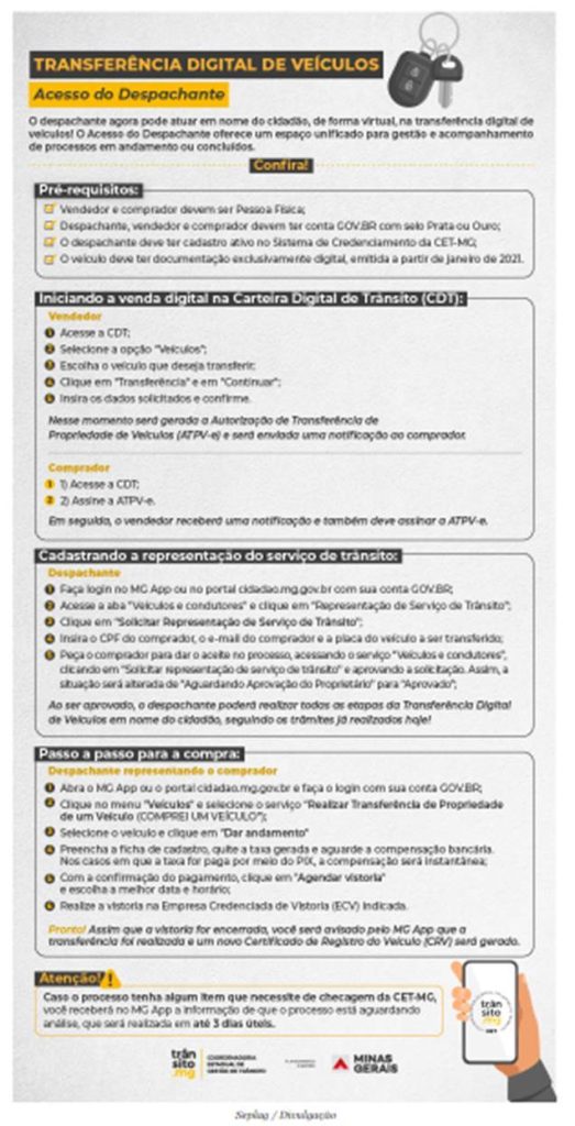 O serviço, disponibilizado pela Coordenadoria Estadual de Gestão de Trânsito (CET), da Secretaria de Estado de Planejamento e Gestão (Seplag-MG), também permite que o cidadão interessado contrate um profissional despachante para conclusão da transferência de propriedade, em formato digital.