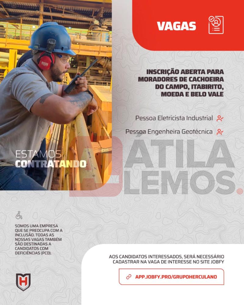 VAGAS DISPONÍVEIS NA HERCULANO MINERAÇÃO, INSCRIÇÕES ABERTAS para moradores de Cachoeira do Campo, Itabirito, Moeda e Belo Vale.