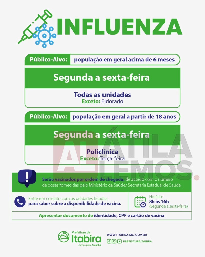 A partir da próxima segunda-feira (5/05) a Prefeitura de Itabira vai ampliar a imunização contra a influenza para toda a população a partir de 6 meses.
