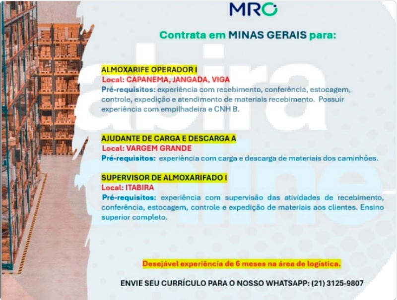 MRO divulga oportunidades de emprego em ITABIRA e outras localidades. Veja onde e como enviar seu currículo.