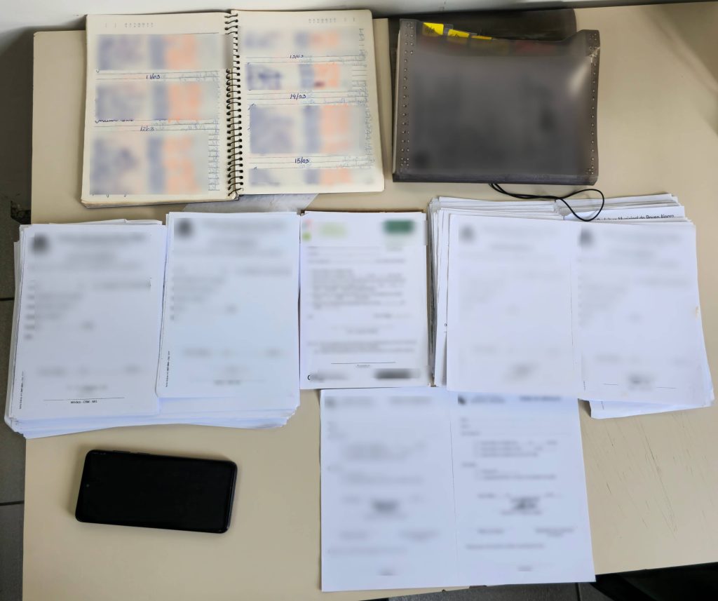 Também foram localizados um caderno com anotações de controle financeiro, que detalhava pagamentos realizados, e uma pasta sanfonada organizada em ordem alfabética, contendo diversos formulários preenchidos. Um dos atestados tinha a mesma data da operação, o que motivou a prisão em flagrante da suspeita.
