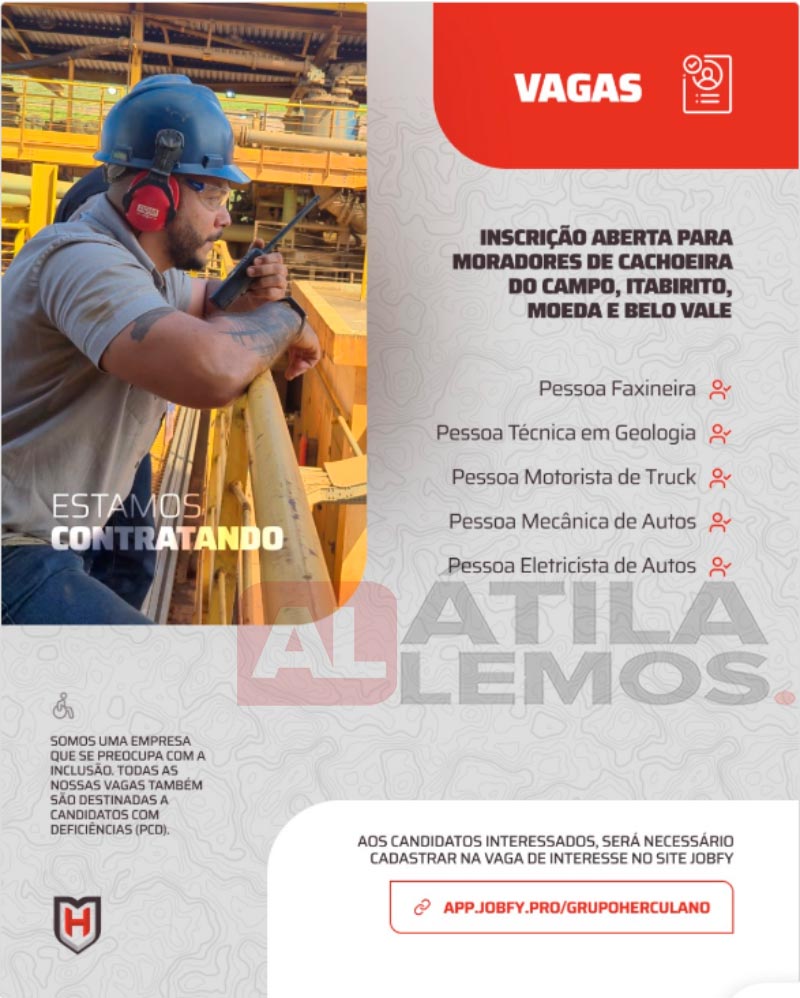 ♿️ Também há oportunidades para candidatos com deficiência (PCD). Cadastre seu currículo em nossa plataforma pelo link: APP.JOBFY.PRO/GRUPOHERCULANO, A Herculano Mineração agradece sua atenção!