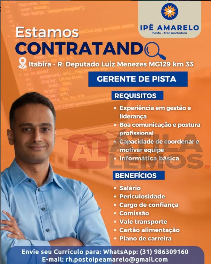 • O site www.atilalemos.com.br , trabalha APENAS na divulgação das vagas. Assim reafirmamos que Não realizamos seleção e/ou contratação. Desta forma pedimos a todos que leiam sempre com muita atenção todos os dados da vaga antes de se candidatar. Envie currículo apenas para as vagas que corresponda ao seu perfil. Nosso Site não faz nenhum tipo de cobrança financeira dos usuários.