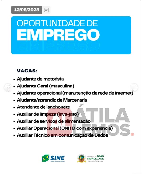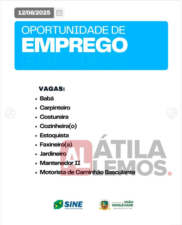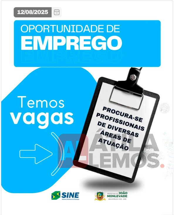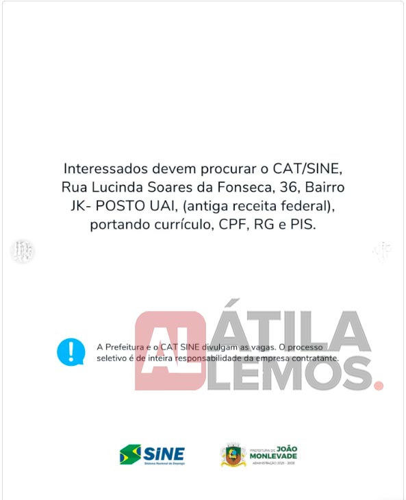 • O site www.atilalemos.com.br , trabalha APENAS na divulgação das vagas. Assim reafirmamos que Não realizamos seleção e/ou contratação. Desta forma pedimos a todos que leiam sempre com muita atenção todos os dados da vaga antes de se candidatar. Envie currículo apenas para as vagas que corresponda ao seu perfil. Nosso Site não faz nenhum tipo de cobrança financeira dos usuários.