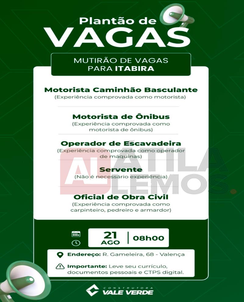 • O site www.atilalemos.com.br , trabalha APENAS na divulgação das vagas. Assim reafirmamos que Não realizamos seleção e/ou contratação. Desta forma pedimos a todos que leiam sempre com muita atenção todos os dados da vaga antes de se candidatar. Envie currículo apenas para as vagas que corresponda ao seu perfil. Nosso Site não faz nenhum tipo de cobrança financeira dos usuários.