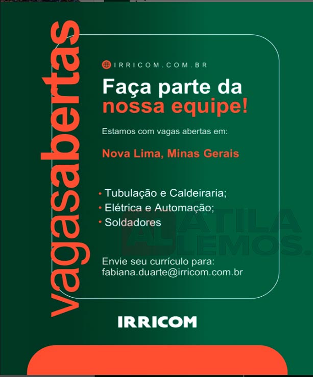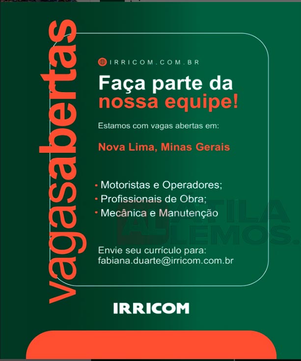 Confira as vagas disponíveis na Irricom nesta semana! Temos oportunidades em Nova Lima e estamos em busca de profissionais comprometidos e qualificados para compor a nossa equipe!