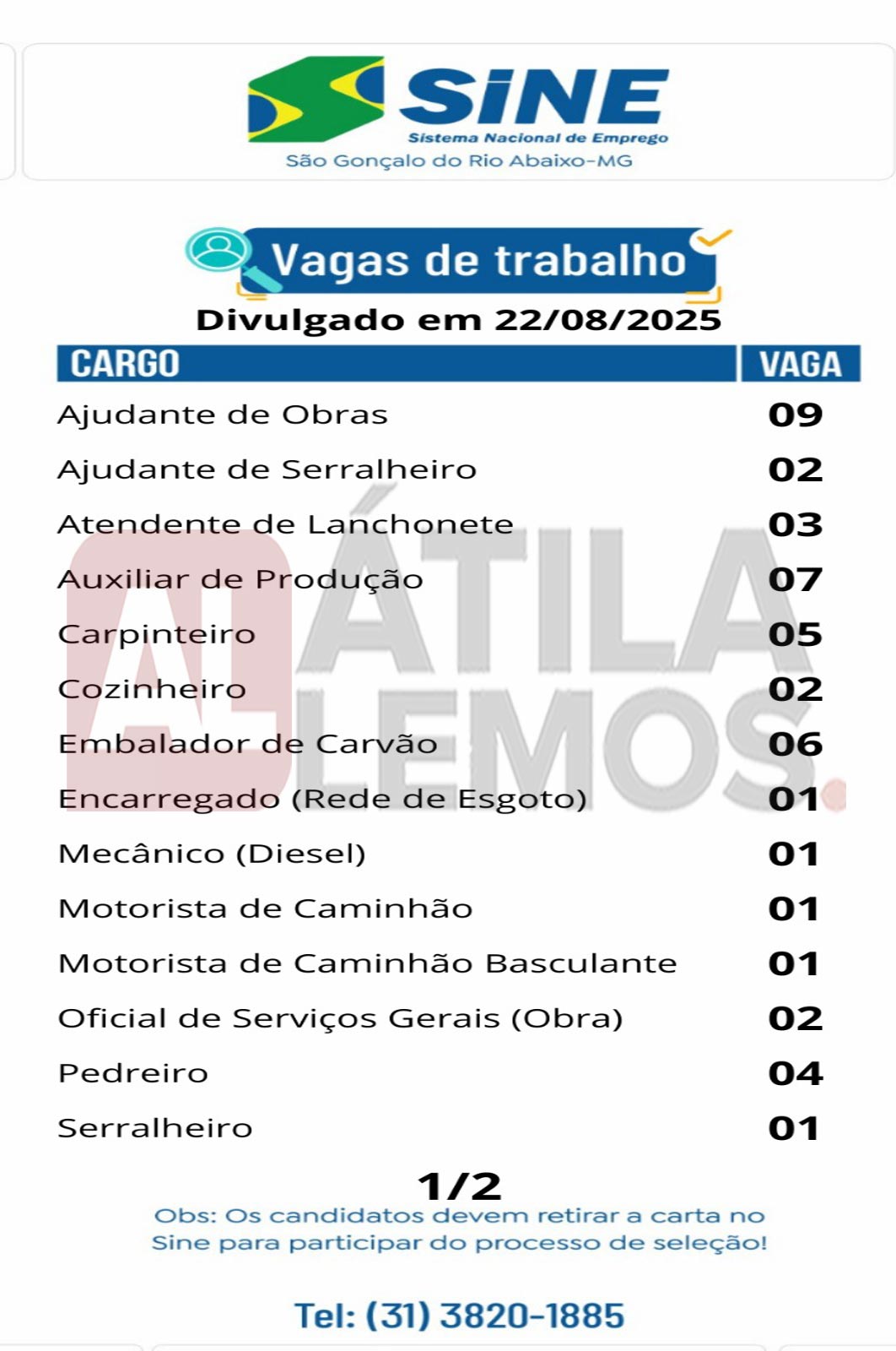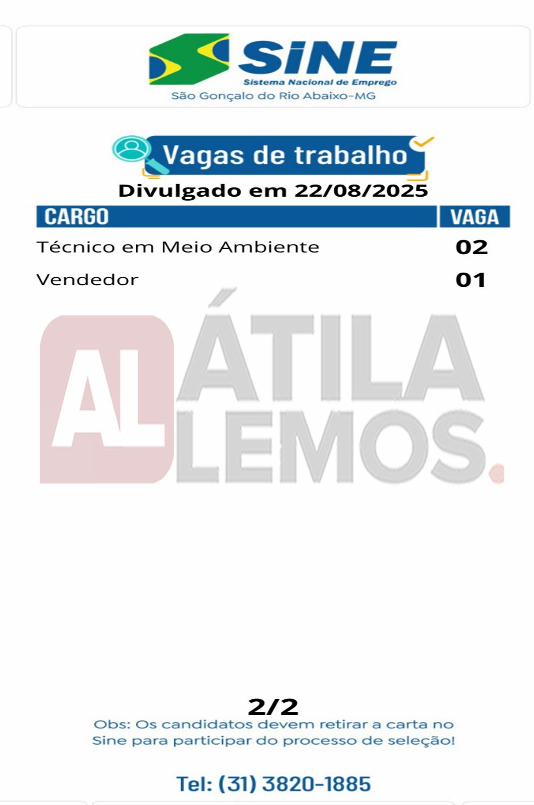 - O site www.atilalemos.com.br , trabalha APENAS na divulgação das vagas. Assim reafirmamos que Não realizamos seleção e/ou contratação. Desta forma pedimos a todos que leiam sempre com muita atenção todos os dados da vaga antes de se candidatar. Envie currículo apenas para as vagas que corresponda ao seu perfil. Nosso Site não faz nenhum tipo de cobrança financeira dos usuários.