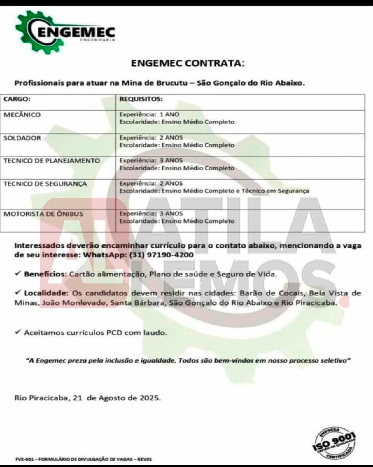 - O site www.atilalemos.com.br , trabalha APENAS na divulgação das vagas. Assim reafirmamos que Não realizamos seleção e/ou contratação. Desta forma pedimos a todos que leiam sempre com muita atenção todos os dados da vaga antes de se candidatar. Envie currículo apenas para as vagas que corresponda ao seu perfil. Nosso Site não faz nenhum tipo de cobrança financeira dos usuários.