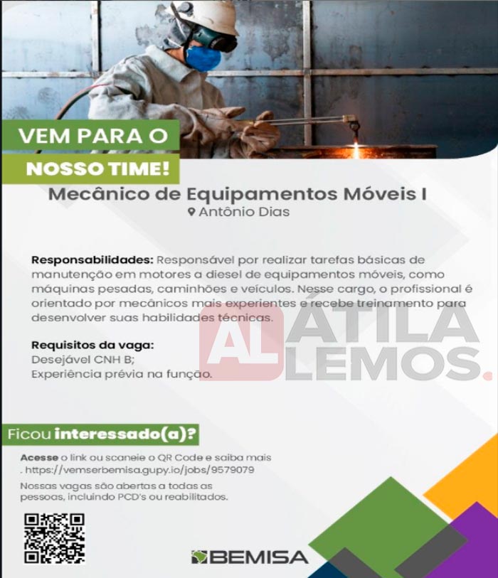 Estamos com oportunidade para o cargo Mecânico de Equipamentos Móveis! Buscamos profissionais com experiência prévia em manutenção de motores a diesel em equipamentos móveis (caminhões, máquinas pesadas e veículos) e disponibilidade para trabalhar em escala de turno. Desejável CNH categoria B. Se você se identifica com o perfil e deseja fazer parte do nosso time, candidate-se pelo link abaixo ou escaneie o QR Code na imagem. https://dgveEi2X