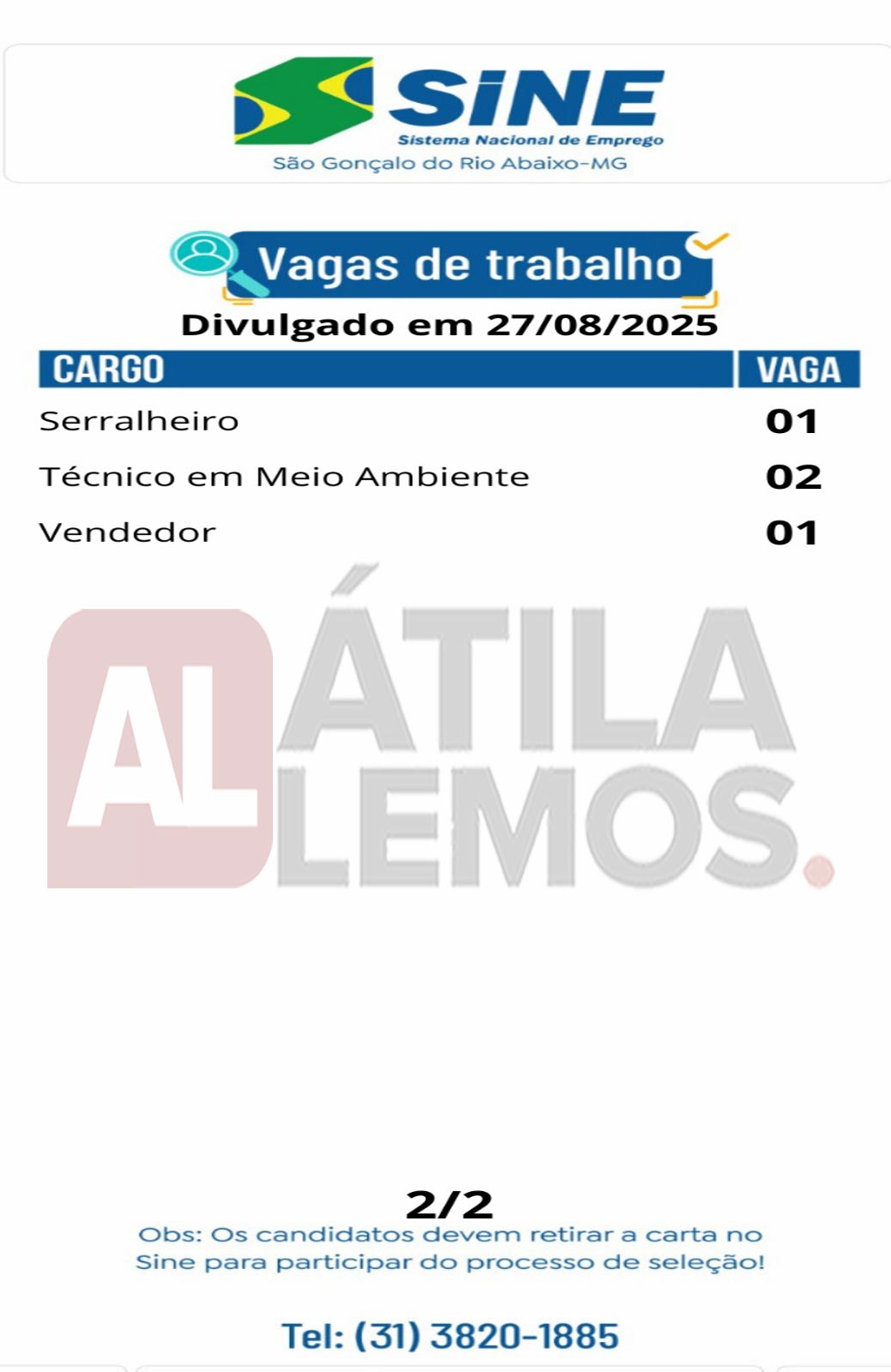 • O site www.atilalemos.com.br , trabalha APENAS na divulgação das vagas. Assim reafirmamos que Não realizamos seleção e/ou contratação. Desta forma pedimos a todos que leiam sempre com muita atenção todos os dados da vaga antes de se candidatar. Envie currículo apenas para as vagas que corresponda ao seu perfil. Nosso Site não faz nenhum tipo de cobrança financeira dos usuários.