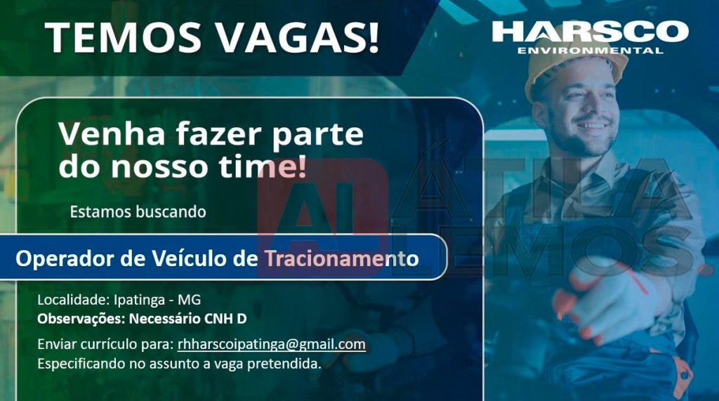 Estamos contratando Operador de Veículo de Tracionamento para a unidade de Ipatinga- MG. Necessário CNH D. Venha fazer parte do nosso time! Envie seu currículo para o e-mail: rhharscoipatinga@gmail.com especificando no assunto a vaga pretendida.
