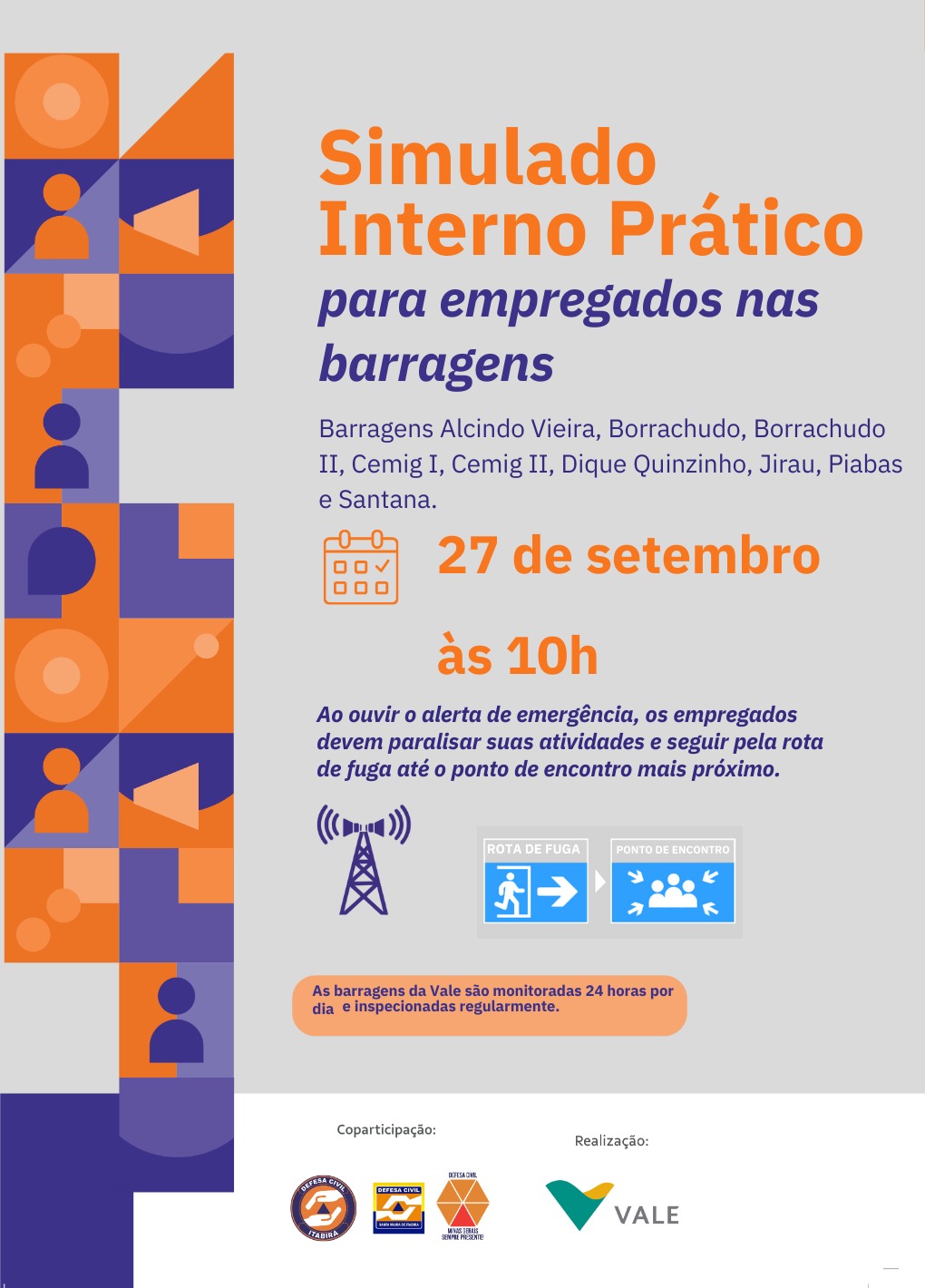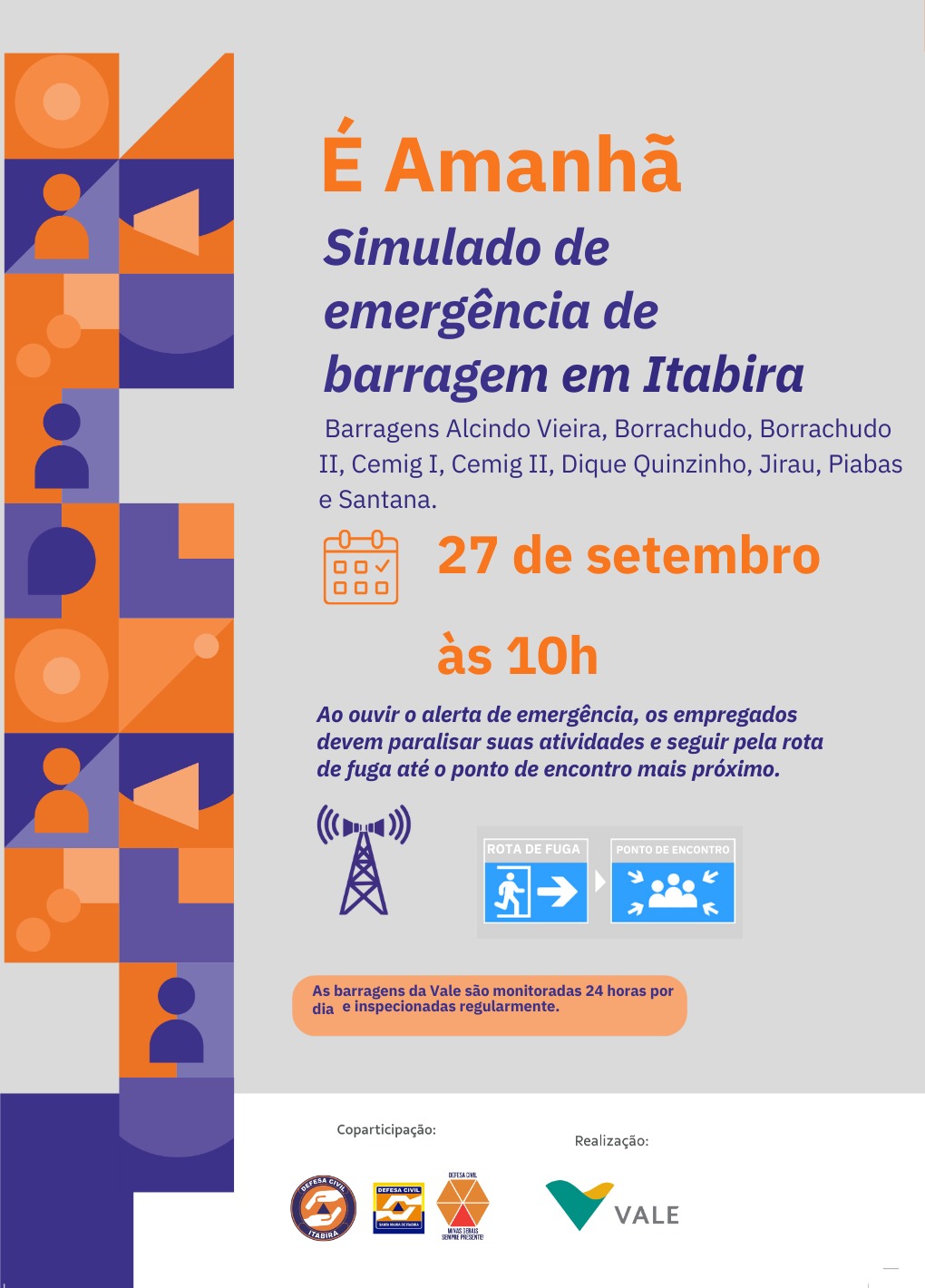 No sábado, dia 27 de setembro, a partir das 10 horas, as Defesas Civis Municipais e a Vale realizarão o simulado prático de emergência das barragens Alcindo Vieira, Borrachudo, Borrachudo II, Cemig I, Cemig II, Dique Quinzinho, Jirau, Piabas e Santana, nos municípios de Itabira e de Santa Maria de Itabira.