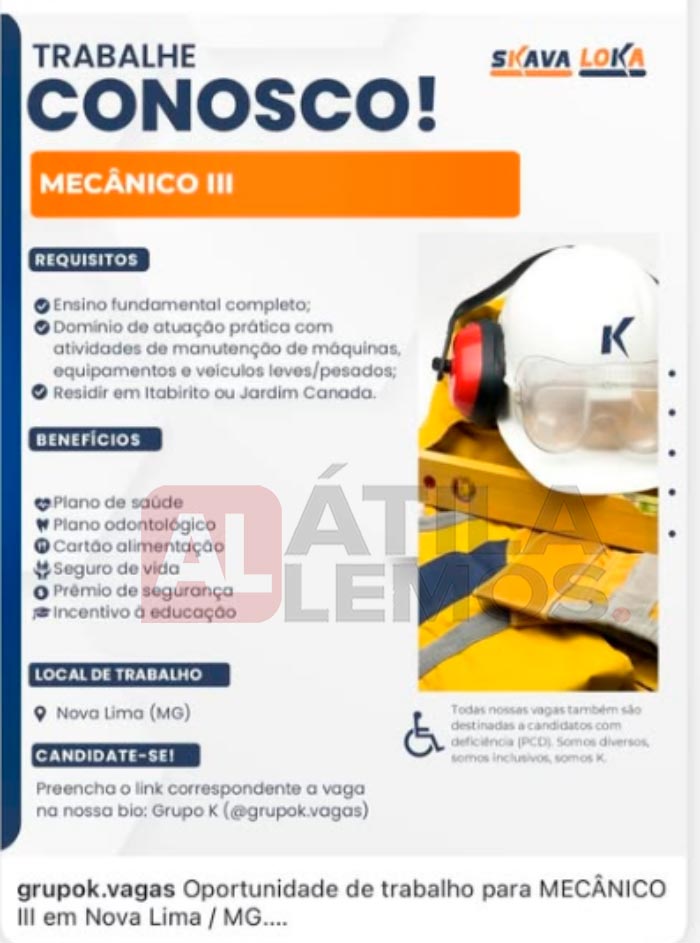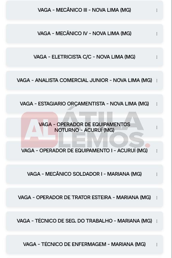 - O site www.atilalemos.com.br , trabalha APENAS na divulgação das vagas. Assim reafirmamos que Não realizamos seleção e/ou contratação. Desta forma pedimos a todos que leiam sempre com muita atenção todos os dados da vaga antes de se candidatar. Envie currículo apenas para as vagas que corresponda ao seu perfil. Nosso Site não faz nenhum tipo de cobrança financeira dos usuários.