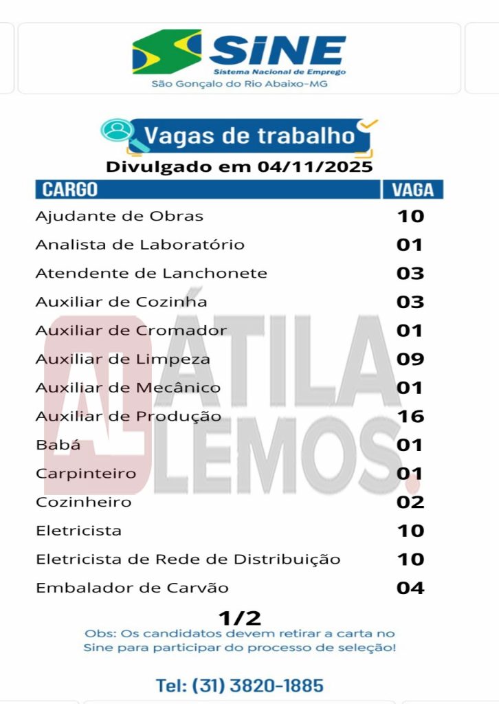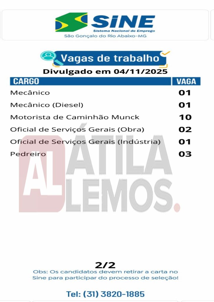 Segue a relação das vagas em aberto na data de hoje no SINE de São Gonçalo do Rio Abaixo – MG.