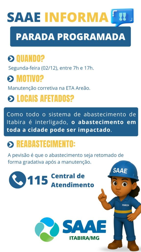 O Serviço Autônomo de Água e Esgoto (SAAE) de Itabira, informa que na próxima terça-feira (02/12) haverá uma parada programada na ETA Areão, para que a equipe técnica da autarquia realize uma manutenção corretiva. A interrupção ocorrerá entre as 07h e 17h, e a previsão é que o reabastecimento gradativo seja iniciado após a conclusão da manutenção.