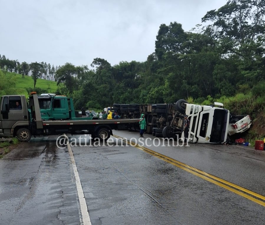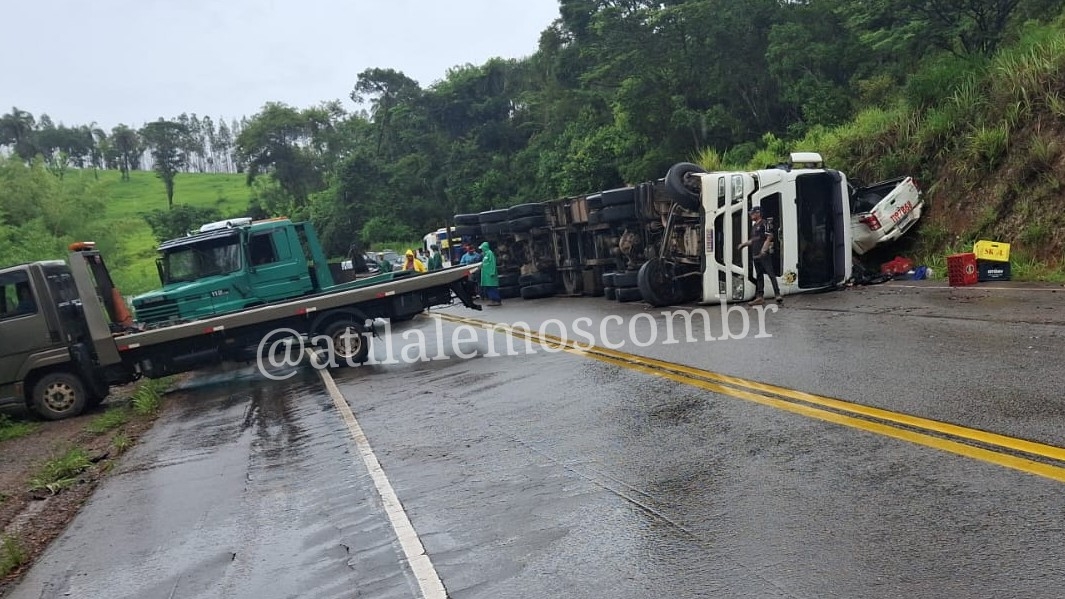 Um acidente envolvendo uma carreta carregada com carga de cerveja foi registrado na rodovia MG-434, nesta terça (20). O veículo tombou na pista e acabou atingindo uma caminhonete que seguia em sentido contrário, no momento do ocorrido. Chovia no momento do acidente.
