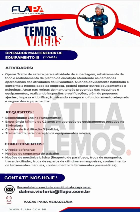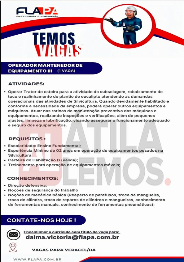 • O site www.atilalemos.com.br , trabalha APENAS na divulgação das vagas. Assim reafirmamos que Não realizamos seleção e/ou contratação. Desta forma pedimos a todos que leiam sempre com muita atenção todos os dados da vaga antes de se candidatar. Envie currículo apenas para as vagas que corresponda ao seu perfil. Nosso Site não faz nenhum tipo de cobrança financeira dos usuários.