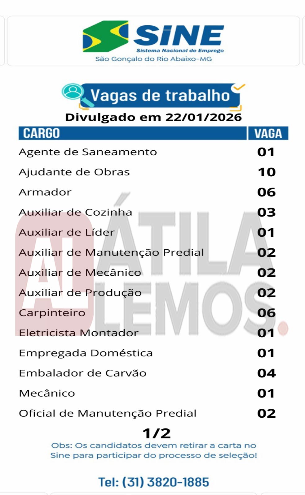 - O site www.atilalemos.com.br , trabalha APENAS na divulgação das vagas. Assim reafirmamos que Não realizamos seleção e/ou contratação. Desta forma pedimos a todos que leiam sempre com muita atenção todos os dados da vaga antes de se candidatar. Envie currículo apenas para as vagas que corresponda ao seu perfil. Nosso Site não faz nenhum tipo de cobrança financeira dos usuários.