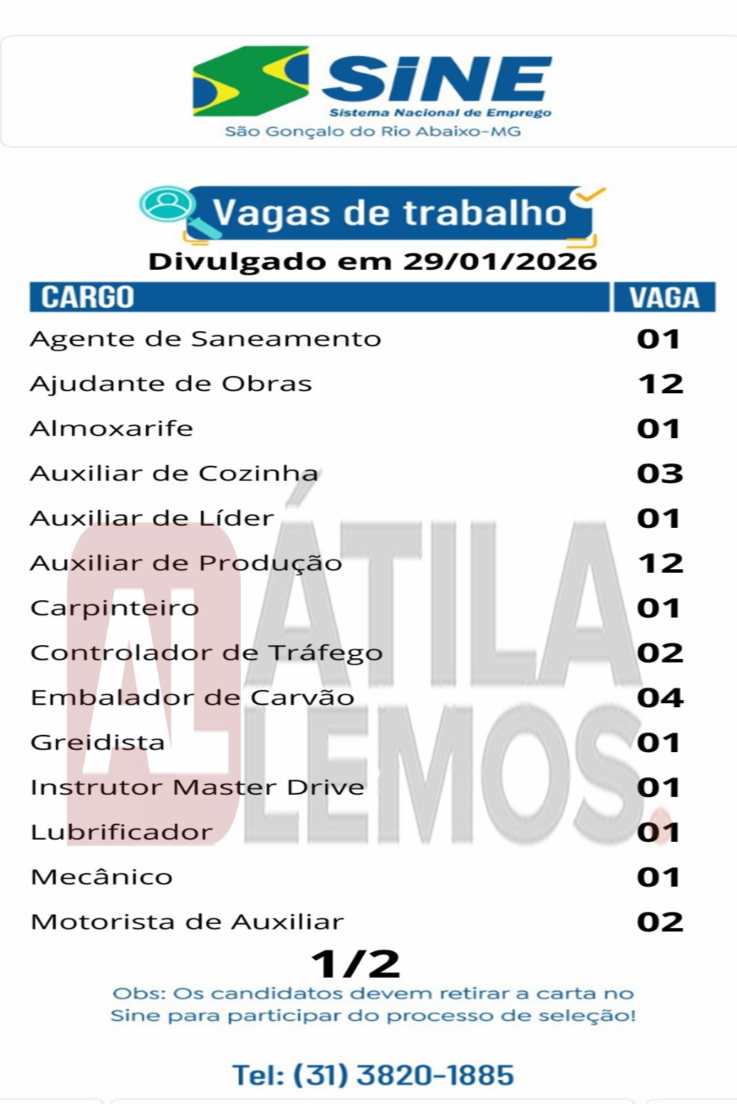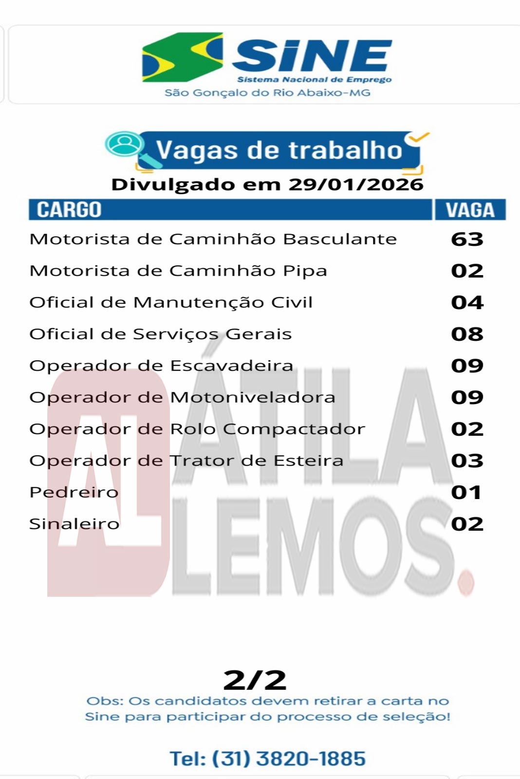 - O site www.atilalemos.com.br , trabalha APENAS na divulgação das vagas. Assim reafirmamos que Não realizamos seleção e/ou contratação. Desta forma pedimos a todos que leiam sempre com muita atenção todos os dados da vaga antes de se candidatar. Envie currículo apenas para as vagas que corresponda ao seu perfil. Nosso Site não faz nenhum tipo de cobrança financeira dos usuários.