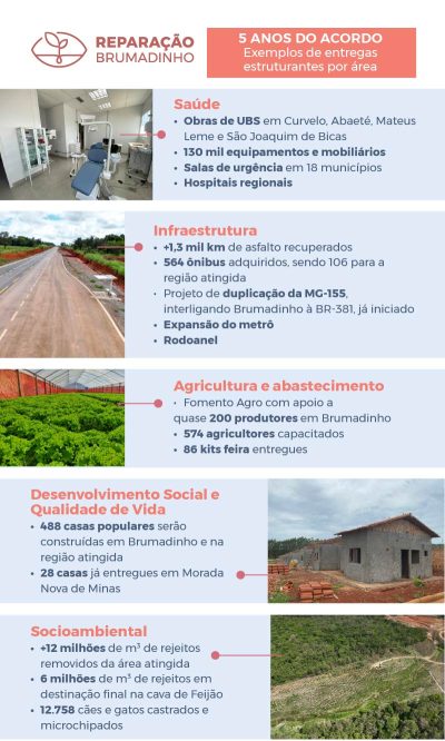 O acordo envolve entregas estruturantes em diferentes frentes. Na área da saúde, por exemplo, inclui obras de Unidades Básicas de Saúde (UBS) em Abaeté, Curvelo, Mateus Leme e São Joaquim de Bicas, entre outros municípios; disponibilização de cerca de 130 mil equipamentos e mobiliários; implantação de salas de urgência em 18 municípios atingidos e reforma de hospitais regionais.