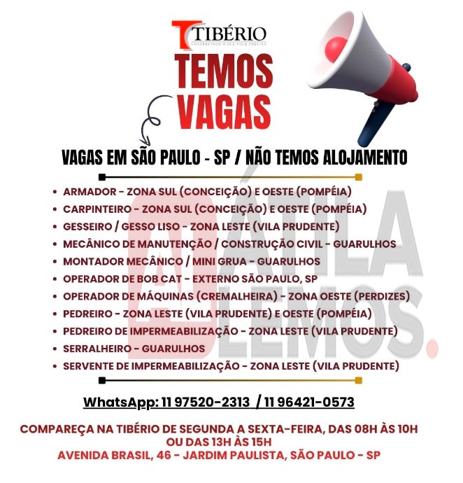 • O site www.atilalemos.com.br , trabalha APENAS na divulgação das vagas. Assim reafirmamos que Não realizamos seleção e/ou contratação. Desta forma pedimos a todos que leiam sempre com muita atenção todos os dados da vaga antes de se candidatar. Envie currículo apenas para as vagas que corresponda ao seu perfil. Nosso Site não faz nenhum tipo de cobrança financeira dos usuários.