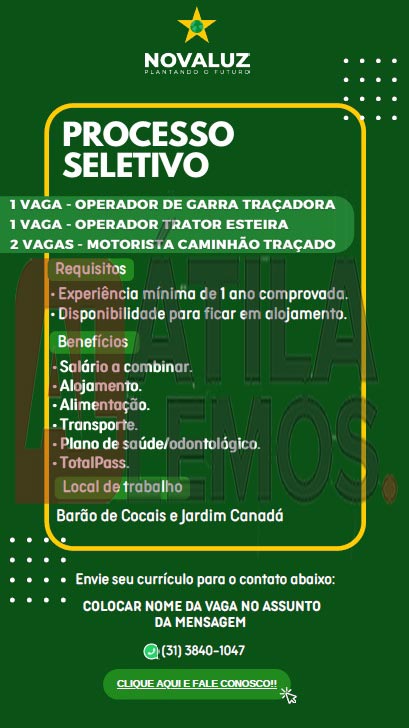 • O site www.atilalemos.com.br atua exclusivamente na divulgação de oportunidades de emprego. Não realizamos processos de seleção, entrevistas ou contratações.
