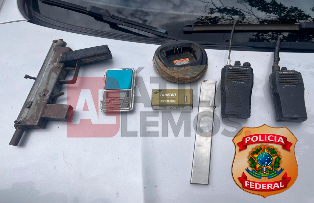 Com o suspeito, foram apreendidos uma submetralhadora, munições, uma balança de precisão e rádios comunicadores, materiais que, segundo as autoridades, reforçam a atuação estruturada da organização criminosa.