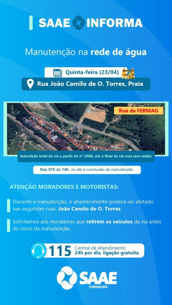 O Serviço Autônomo de Água e Esgoto (Saae) de Itabira informa que a Rua João Camilo de Oliveira Torres, a partir do número 2090, será interditada nesta quinta-feira (23),  para a manutenção e correção de vazamento de água.
