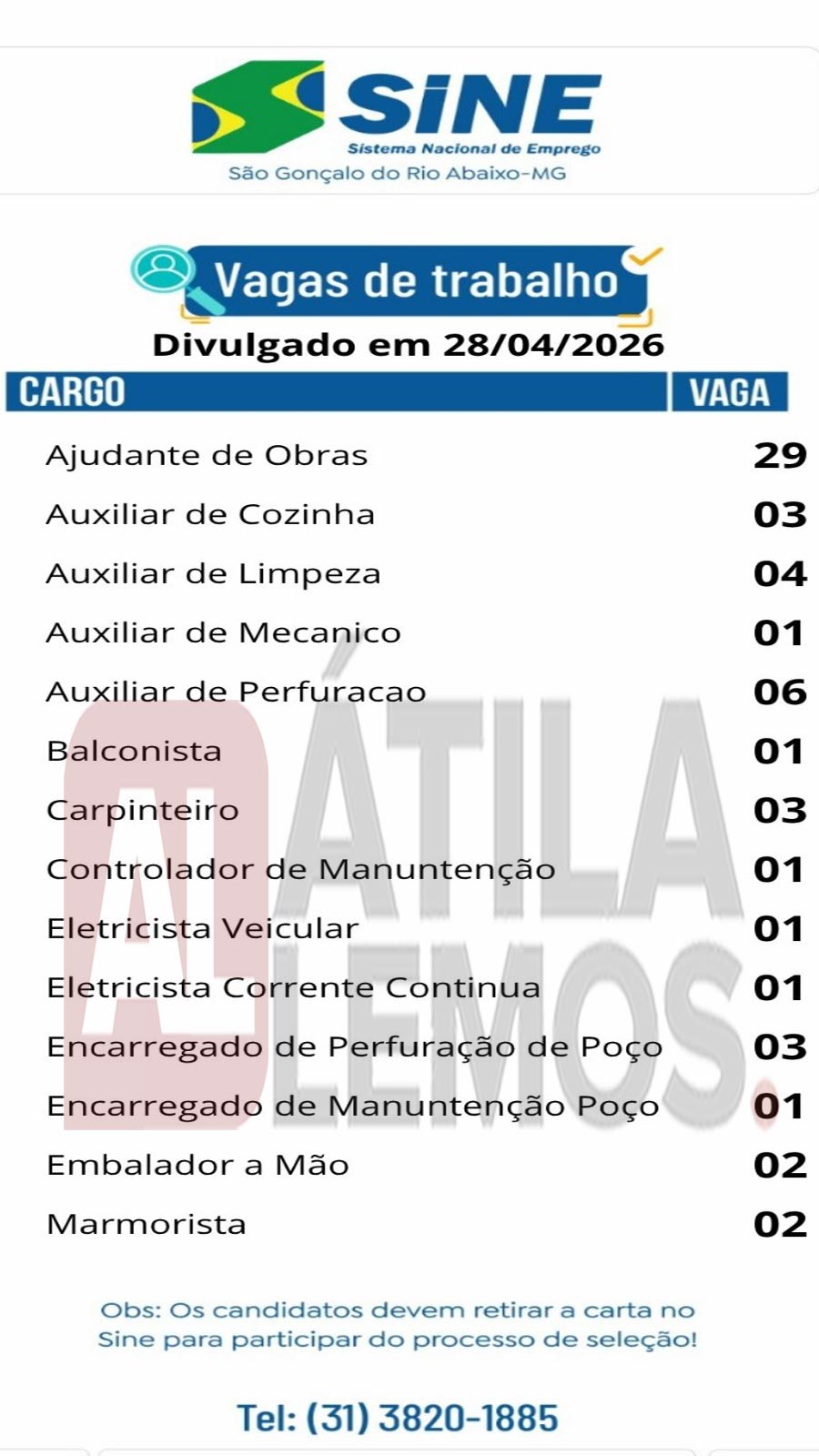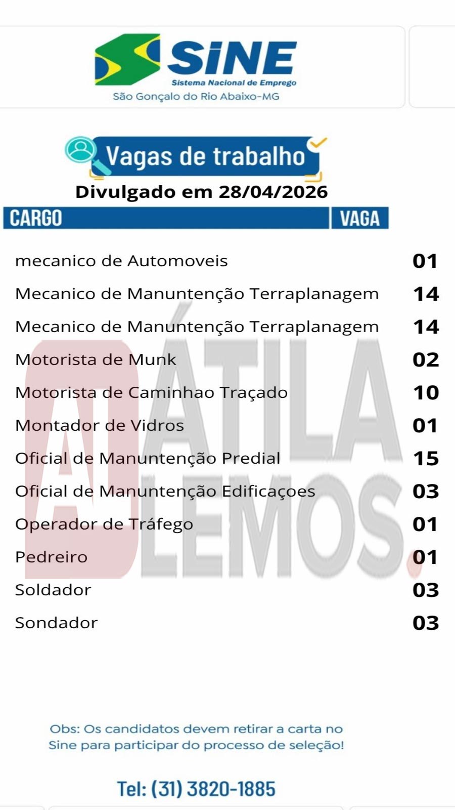 - O site www.atilalemos.com.br atua exclusivamente na divulgação de oportunidades de emprego. Não realizamos processos de seleção, entrevistas ou contratações.Reforçamos a importância de que os candidatos leiam atentamente todas as informações da vaga antes de se candidatar e enviem currículo apenas para as oportunidades que estejam de acordo com seu perfil profissional.