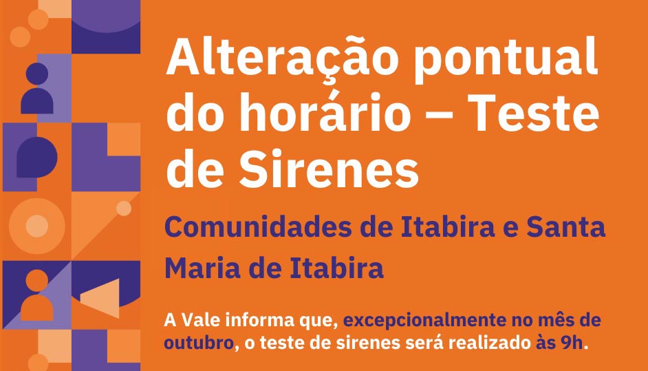 Teste de sirenes em Itabira terá horário antecipado em outubro A mudança no horário ocorre apenas neste mês e a atividade não exige nenhuma ação dos moradores No próximo sábado, dia 4/10, o teste das sirenes em Itabira e em Santa Maria de Itabira será realizado uma hora antes do habitual, às 9 horas. A […]